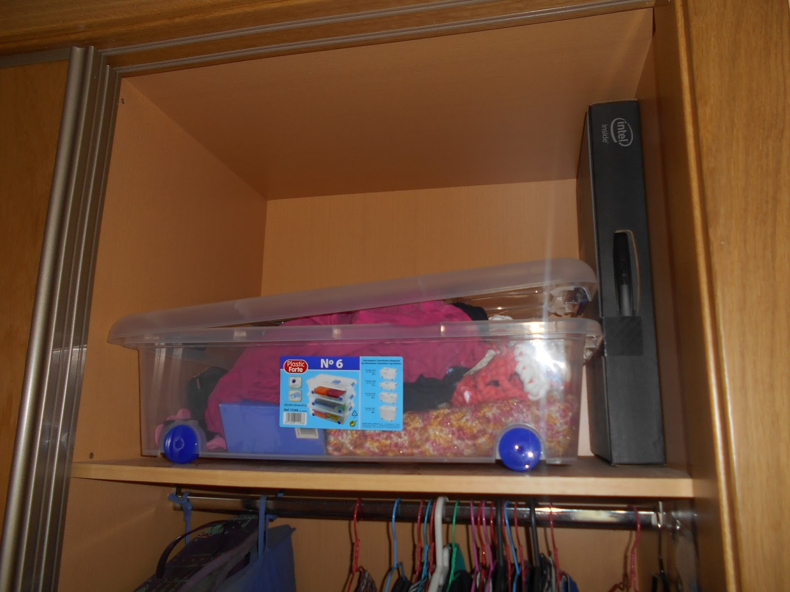 Este armarinho ficou com as meias "perdidas" em cima (vou ter que arranjar um jeito para elas), e do lado direito tem roupas de desporto (porque se eu não as tenho acessiveis eu sei que não me levanto cedo para fazer exercício) e do lado esquerdo tem um conjunto de lençóis e algumas sacas de guardar a vácuo.